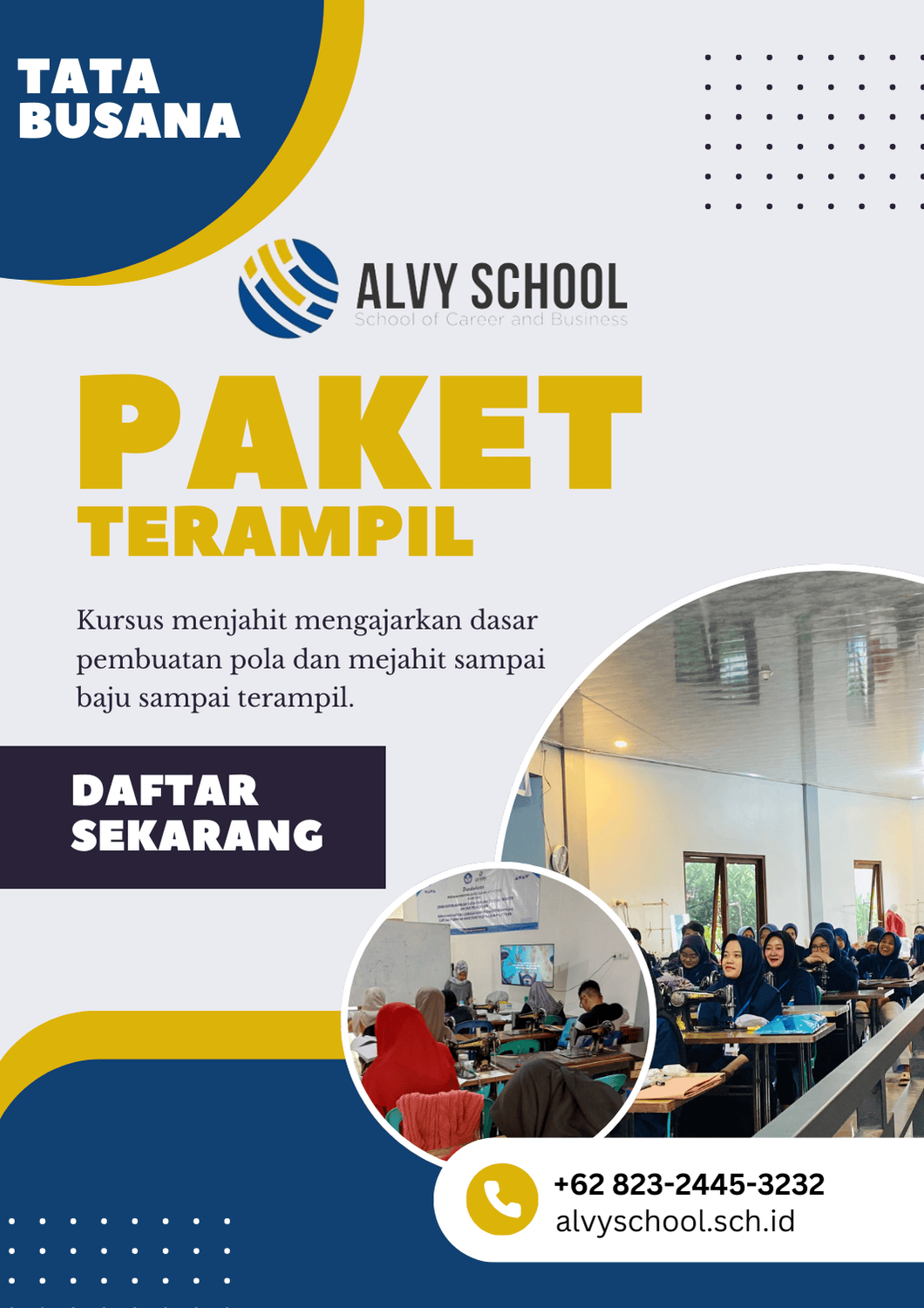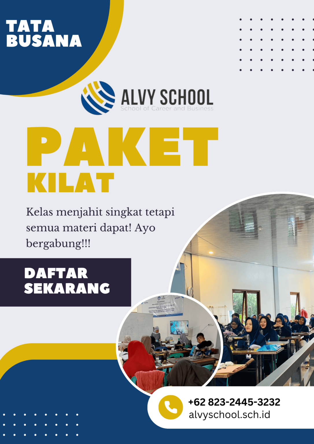 Kelas tata busana untuk anda yang ingin menjadi seorang pengusaha butik atau tailor, di kelas ini anda akan belajar keterampilan seputar busana atau pakaian seperti menjahit membuat pola dan mendesain pakayan sesuai kebutuhan atau permintaan pelanggan.