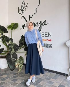 - Kombinasi Warna Komplementer: Memadukan atasan biru dengan bawahan orange menciptakan kontras yang menarik.