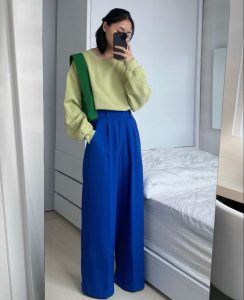 Sumber foto: Pinterest - Kombinasi Warna Monokromatik: Menggunakan berbagai nuansa warna yang sama, seperti atasan biru muda dengan bawahan biru tua, memberikan tampilan yang elegan.