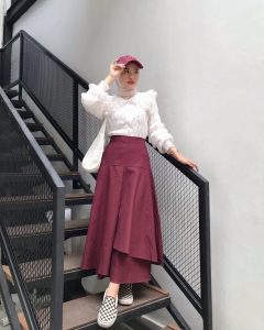 Sumber foto: Pinterest - Kombinasi Warna Netral dan Cerah: Memadukan atasan putih dengan bawahan merah menciptakan tampilan yang seimbang.